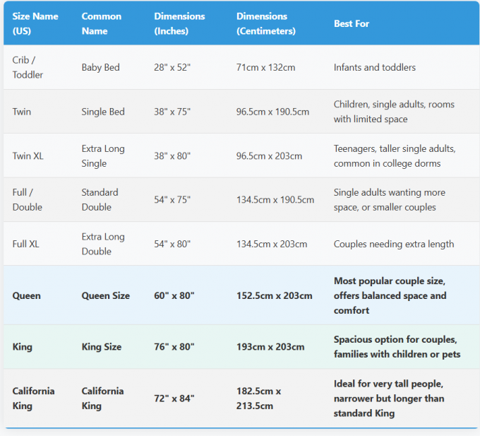 Özel boyutlar dahil olmak üzere tüm yatak boyutları mevcuttur